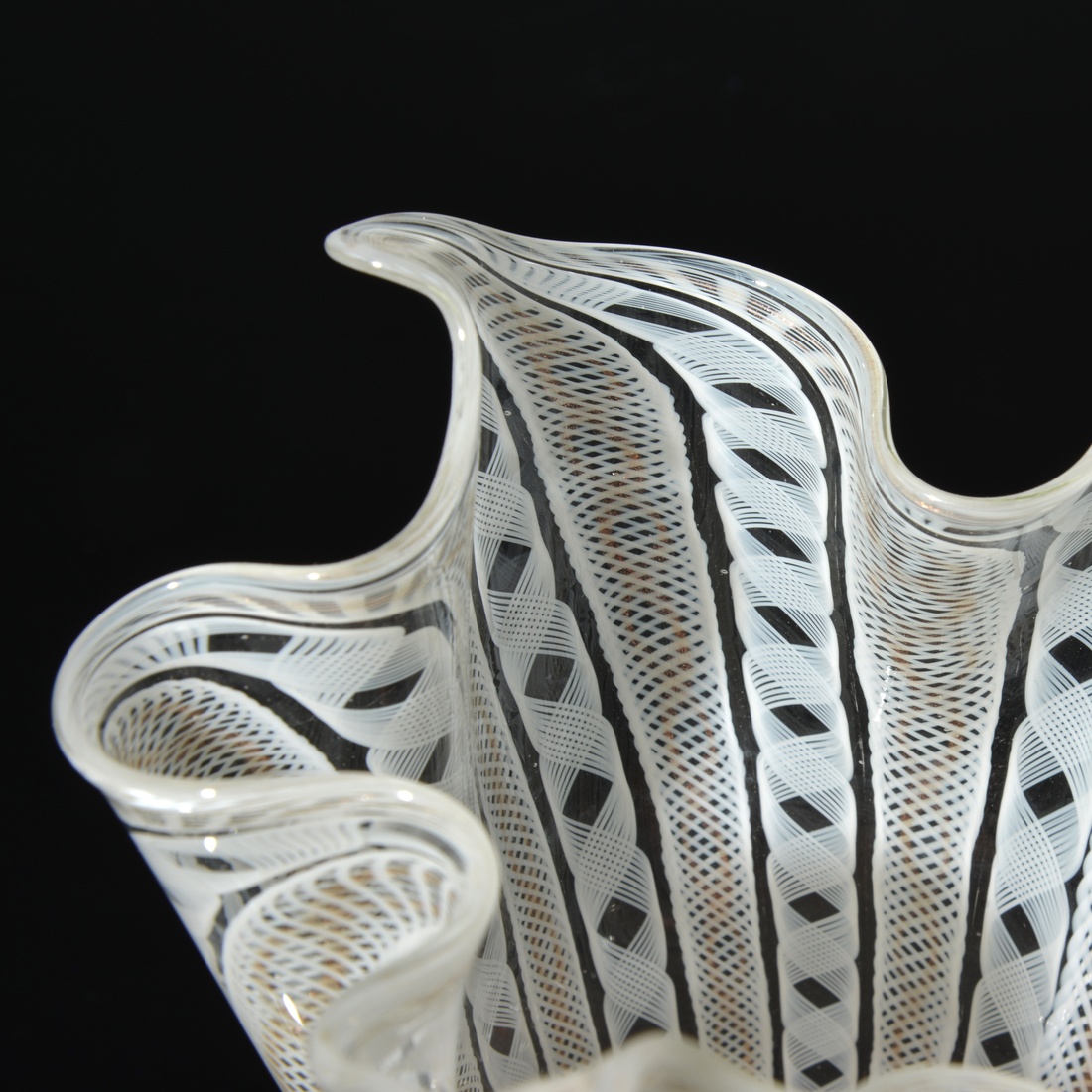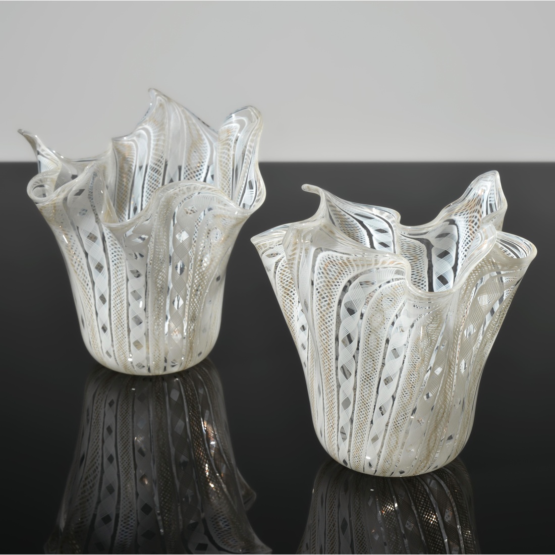Additional Information: The vase technique is “Latticino.” The “fazzoletto” design and form was originally created by Fulvio Bianconi for Venini in 1949. Other leading Murano furnaces like Seguso Vetri d’Arte and Fratelli Toso soon replicated this popular handkerchief design. Reference (one pictured): Circa Fifties Glass from Europe & America, Leslie Pina, pg. 104. Provenance: Collection of Leslie & Ramon Pina, Beachwood, Ohio.