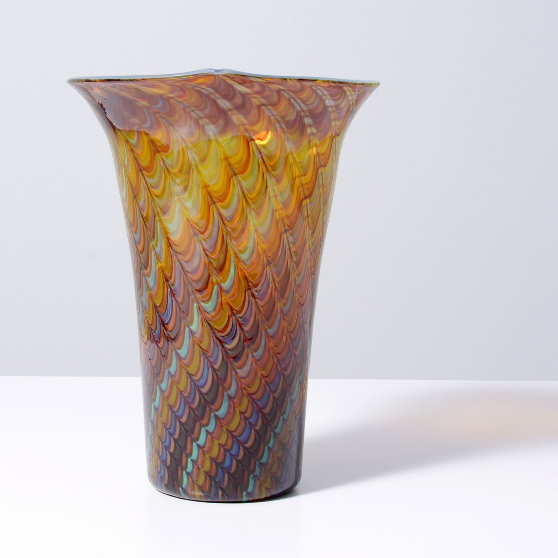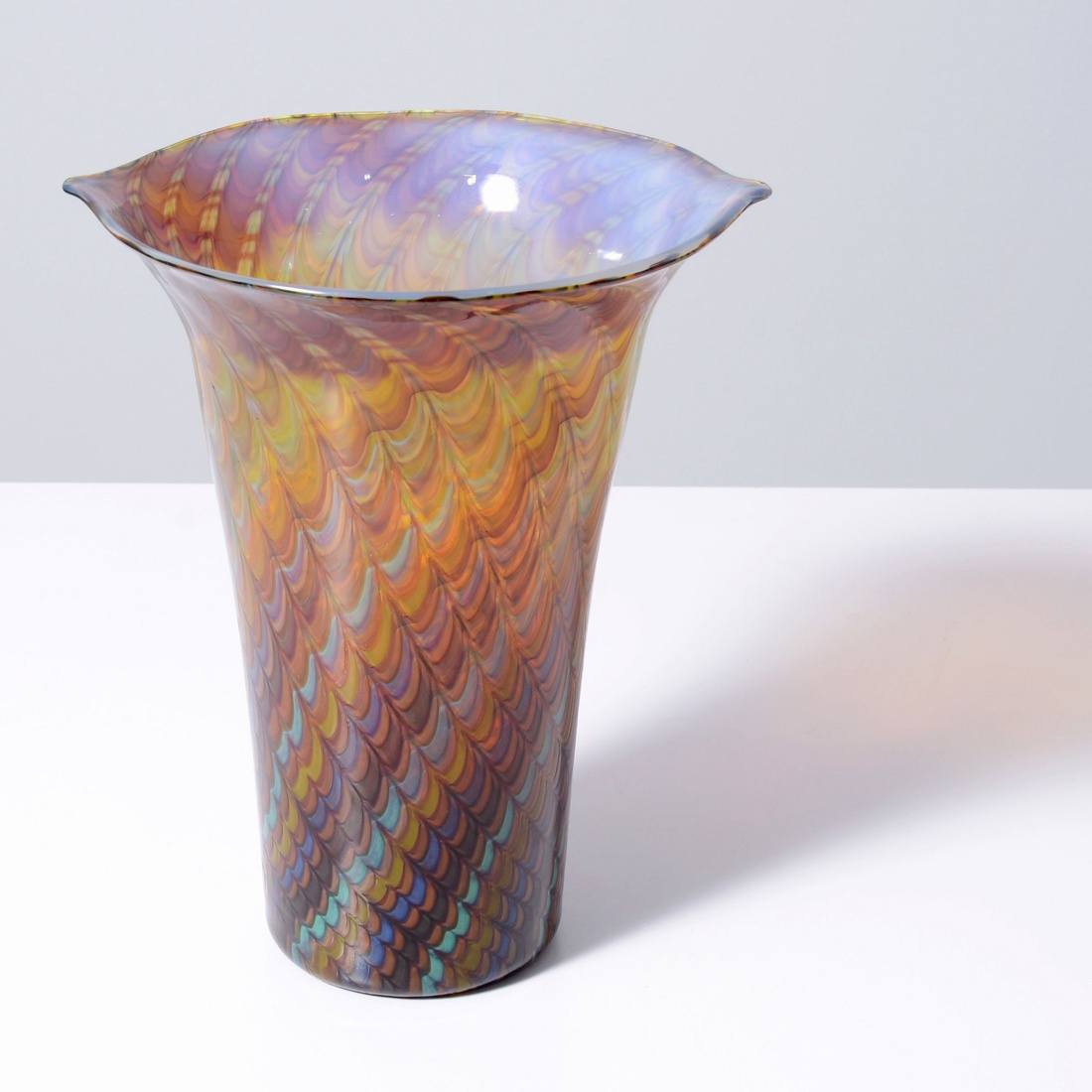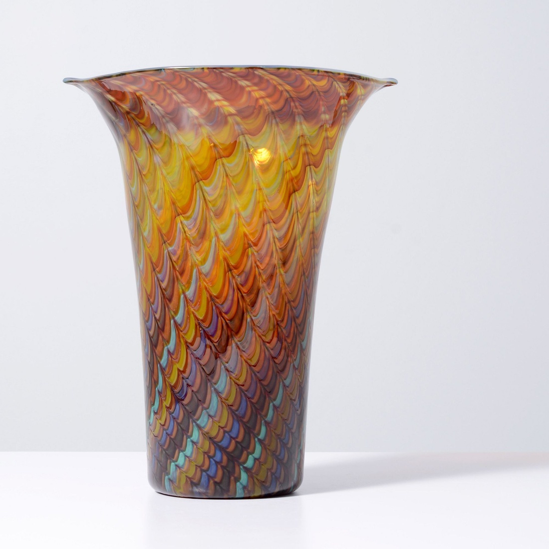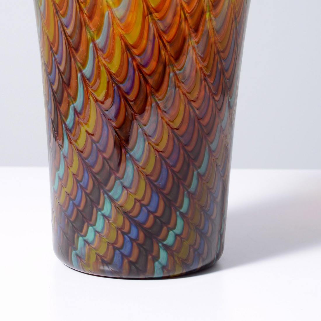 About the collection: The late collector’s wife recalls their first glass purchase in a London antique shop circa 1985, which ignited a 30+ year passion for the genre. The couple and their daughter acquired pieces individually during their travels around Western Europe, Toronto, and New York, and ultimately amassed around 300 vessels and sculptures by artists including Fulvio Bianconi, Toots Zynsky, Carlo Scarpa, Ercole Barovier, Paolo Venini, Vittorio Ferro and others. “My husband became a student of the art he collected,” recalls Mrs. N. and their daughter. “With each new artist he admired, he would buy books about them, and the biographies and catalogs became catalysts for acquiring more pieces. He was always looking for variety, and he would seek out individual pieces to round out a segment of the collection. When something caught his eye, he pounced on it, and if he couldn’t have that particular piece, he’d search for one like it.”Marking(s); notes: signed, label; circa 1965