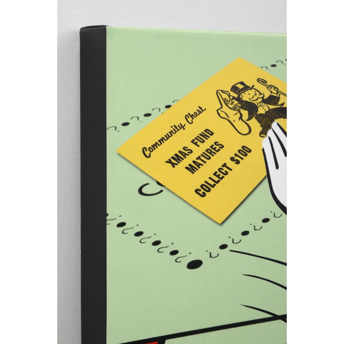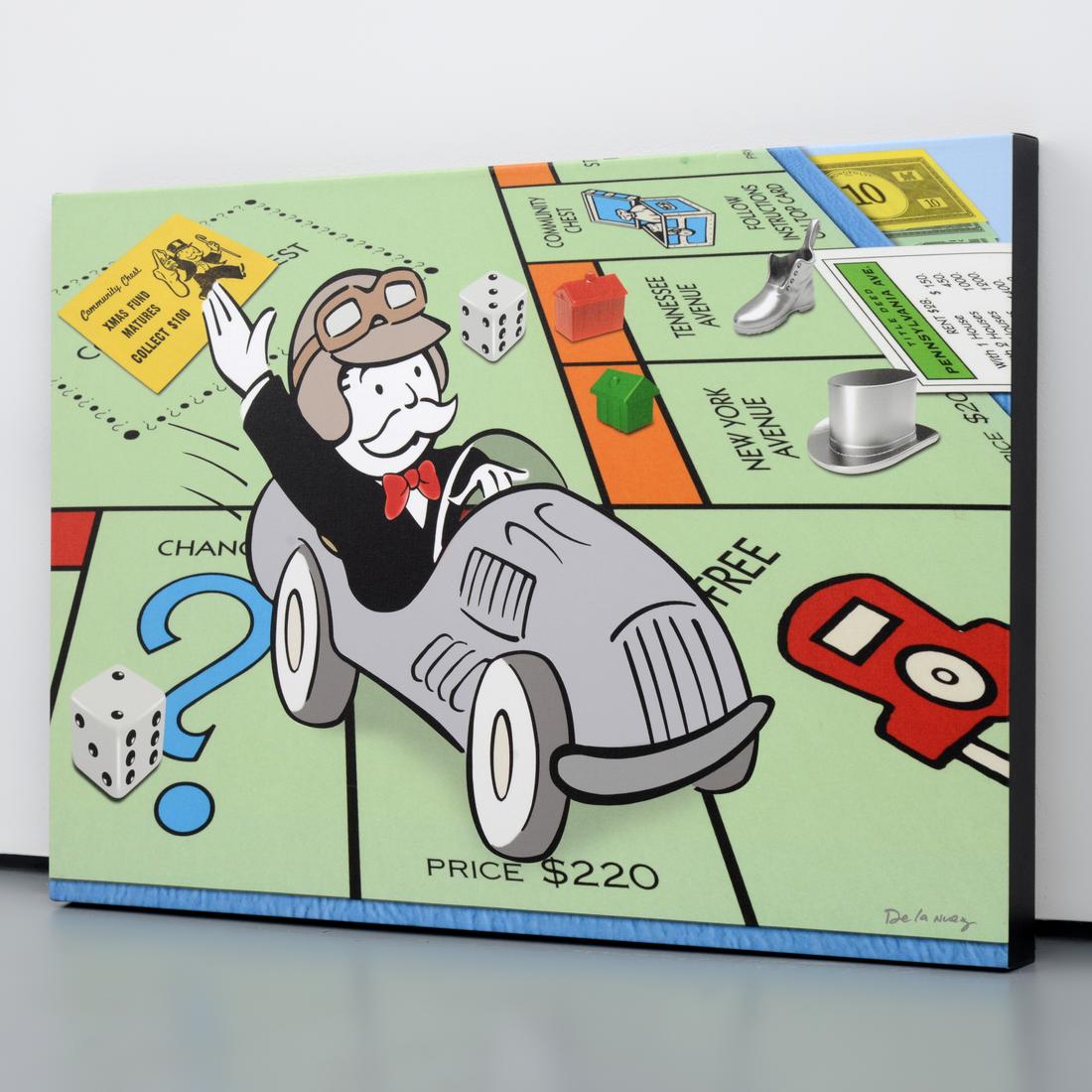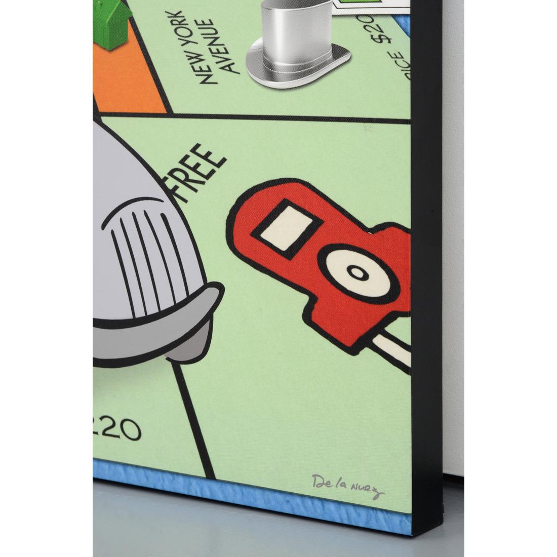 Additional Information: Nelson De La Nuez turns Monopoly’s “Free Parking” square into a 24 x 36‑inch mixed‑media canvas, layering acrylic, collage fragments, and resin. The work’s brand‑appropriation humor echoes the Pop strategies of Andy Warhol, Roy Lichtenstein, and Mr. Brainwash, situating the piece squarely within contemporary consumer‑culture related art.