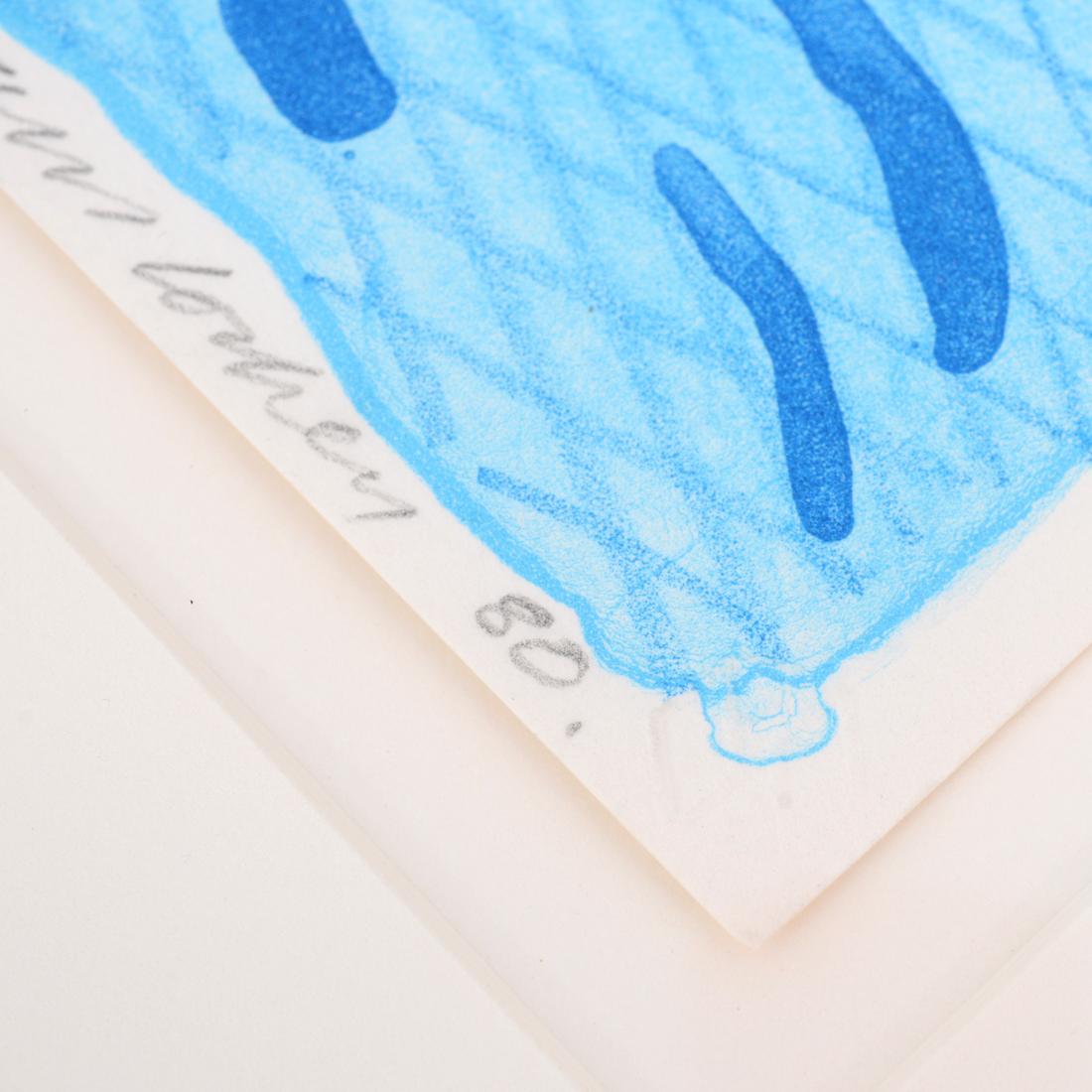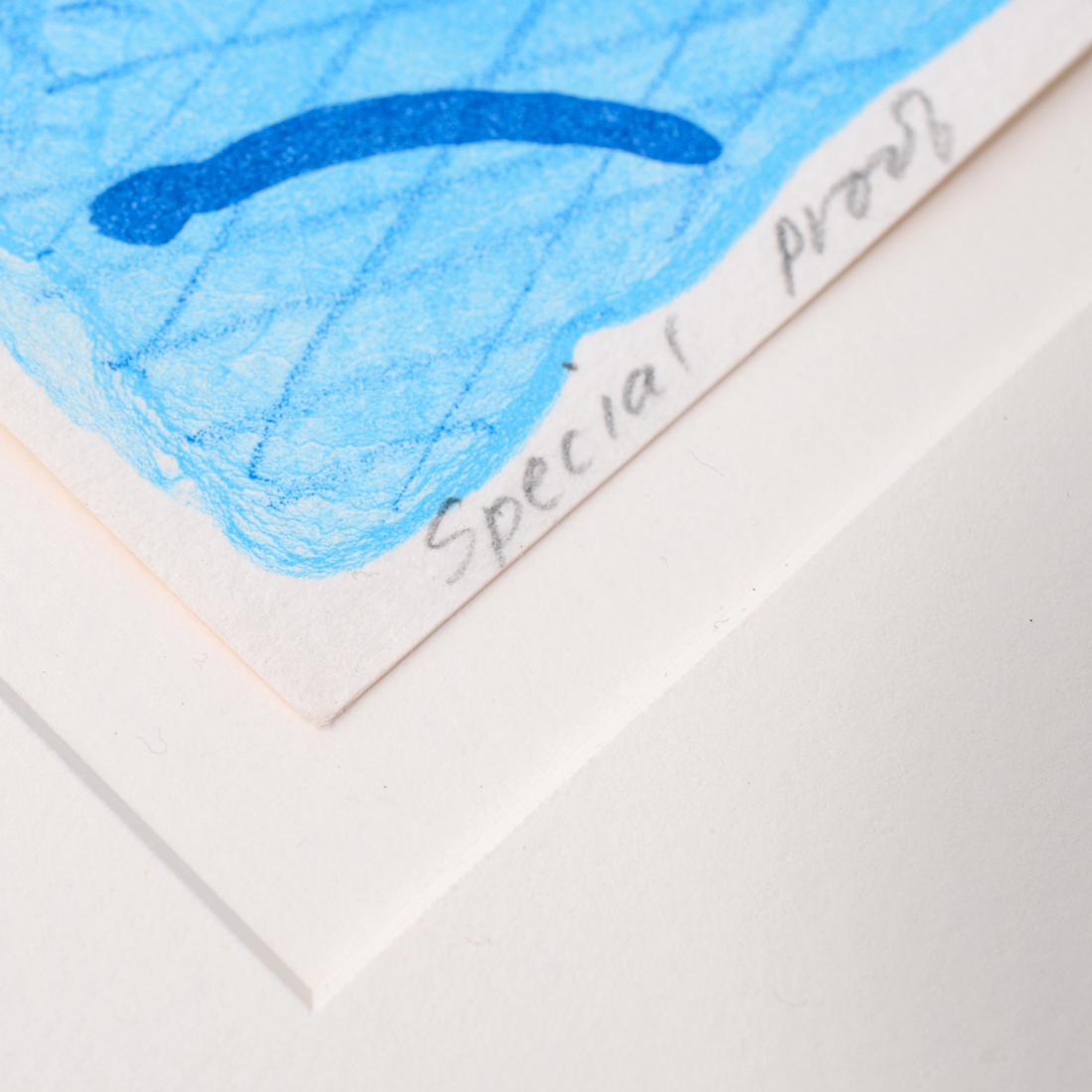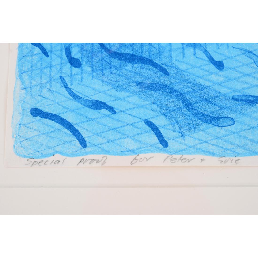 The complete title of the work is “Pool Made with Paper and Blue Ink for Book,” from the “Paper Pools” limited-edition book. The lithograph was printed and published by Tyler Graphics, New York. Pencil inscription recto reads “Special Proof for Peter & Eric.” Provenance: Estate of Peter Schlesinger and Eric Boman / Private Collection, South Woodstock, Vermont / Vertu Fine Art, Boca Raton, Florida / Private Collection, Florida. The proof comes from Peter Schlesinger, widely recognised as David Hockney’s muse and former partner, and from Schlesinger’s subsequent companion, the photographer Eric Boman.