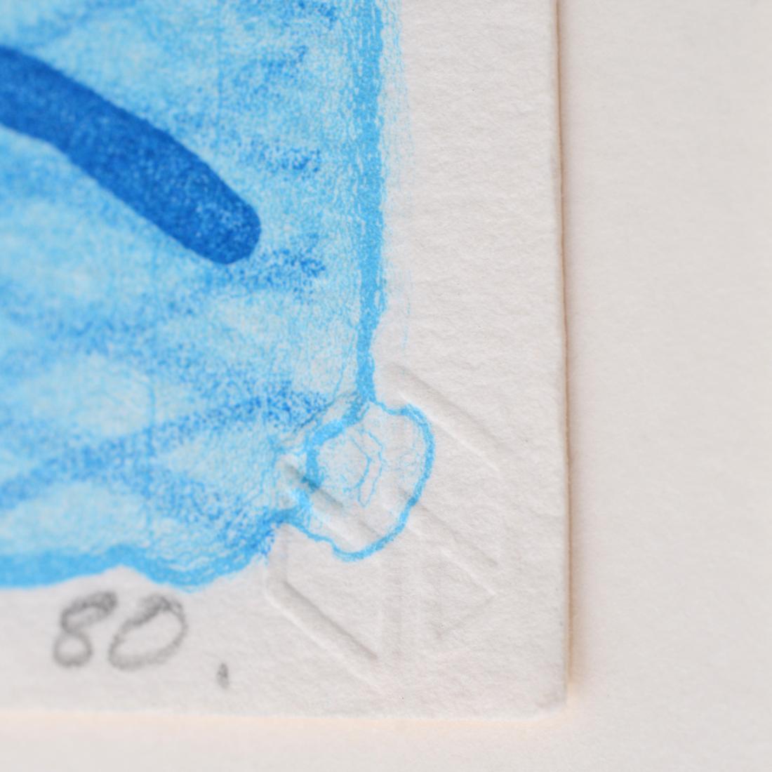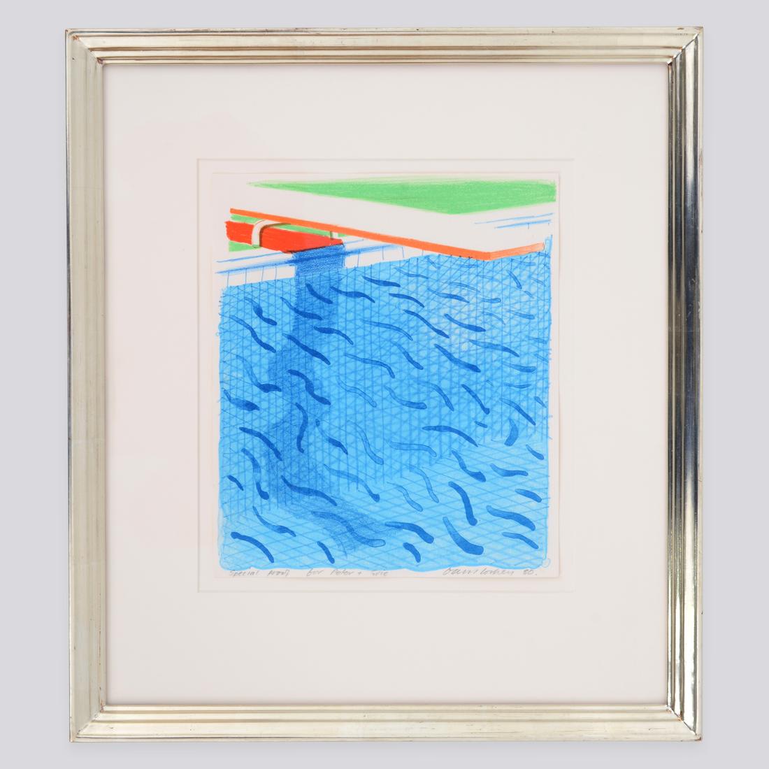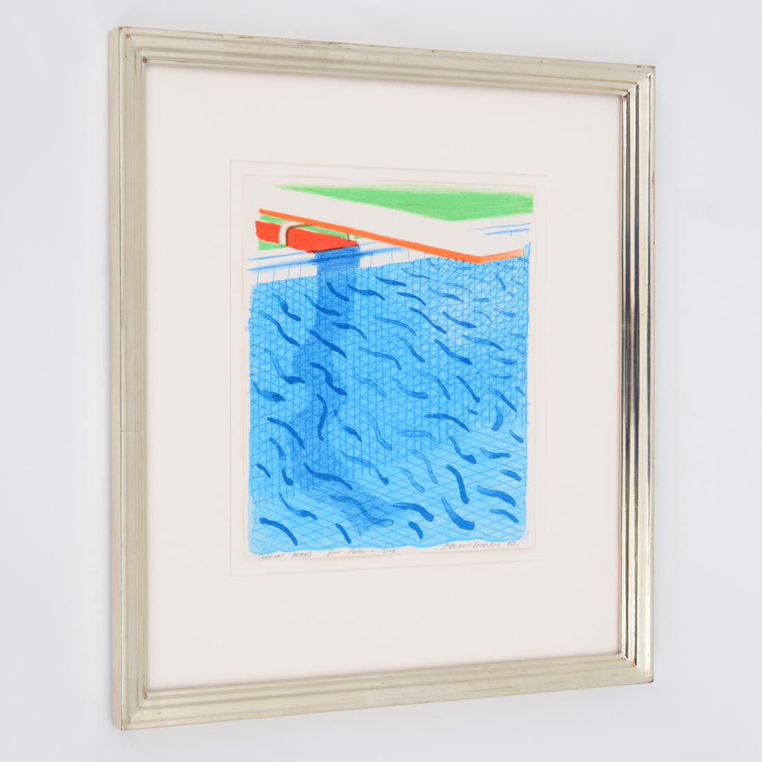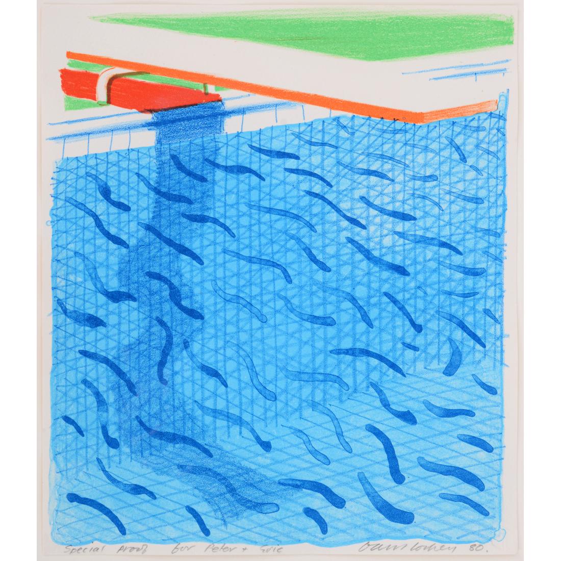 The complete title of the work is “Pool Made with Paper and Blue Ink for Book,” from the “Paper Pools” limited-edition book. The lithograph was printed and published by Tyler Graphics, New York. Pencil inscription recto reads “Special Proof for Peter & Eric.” Provenance: Estate of Peter Schlesinger and Eric Boman / Private Collection, South Woodstock, Vermont / Vertu Fine Art, Boca Raton, Florida / Private Collection, Florida. The proof comes from Peter Schlesinger, widely recognised as David Hockney’s muse and former partner, and from Schlesinger’s subsequent companion, the photographer Eric Boman.
