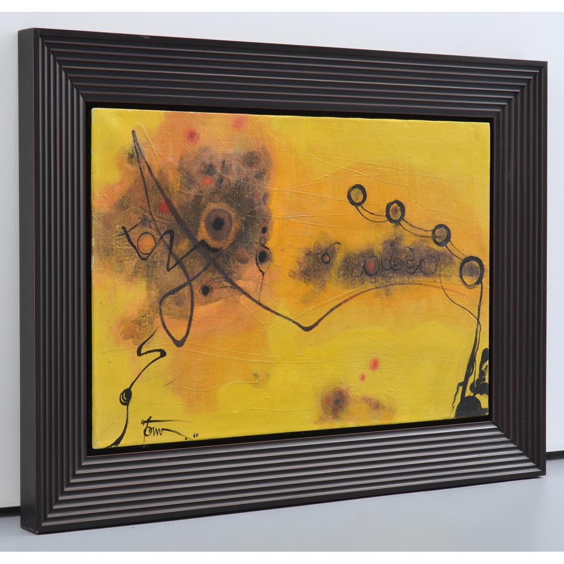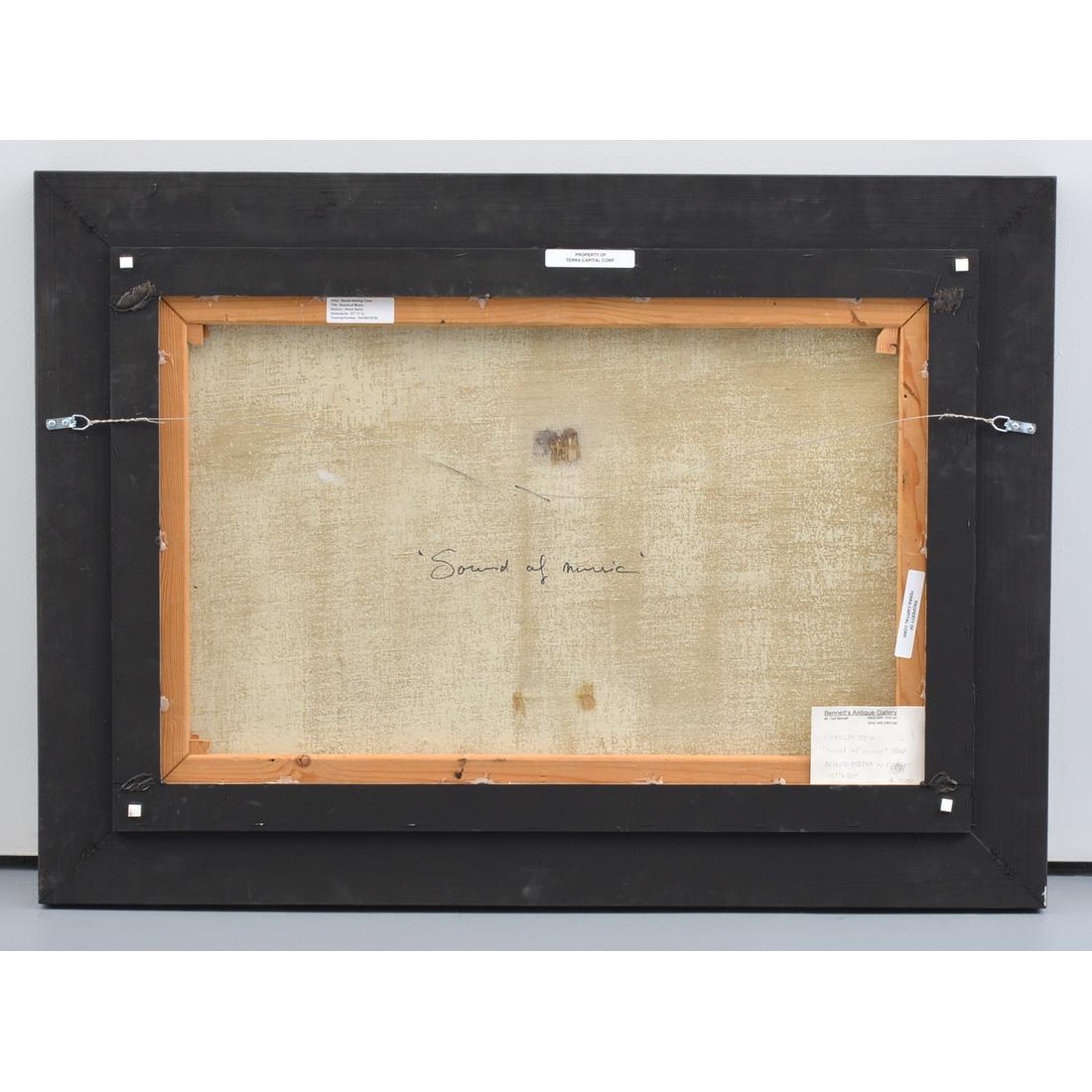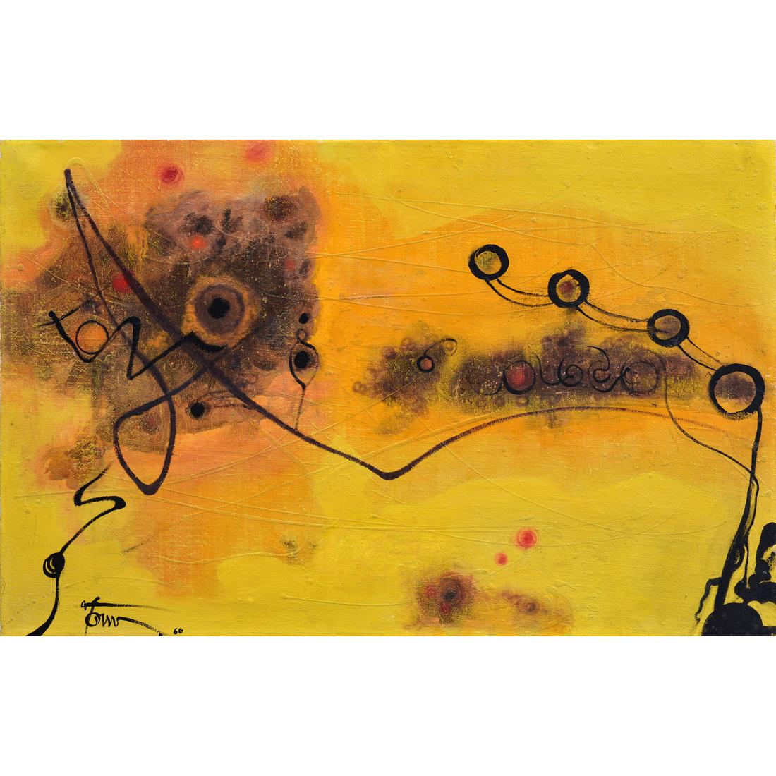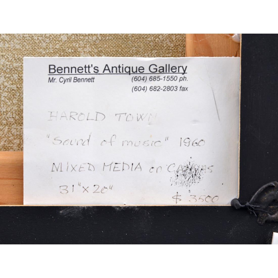 | Additional Information | Work is titled “Sound of Music.” Harold Town is a founding member of Painters Eleven, a group of Torontonian artists who banded together in 1953 for the purpose of promoting and exhibiting abstract art. The group disbanded in 1960, having achieved their purpose. (sources: painters-eleven./com; canadashistory.ca). Gallery and other labels to reverse: Bennett’s Antique Gallery, Canada; Property of Terra Capital Corp. Provenance: Private Collection, Calgary, Alberta, Canada. Consignor is a collector focusing solely on works by Canadian artists, including pieces in this auction by Harold Barling Town, Ronald Bloore, Molly Bobak and Stanley Cosgrove. |