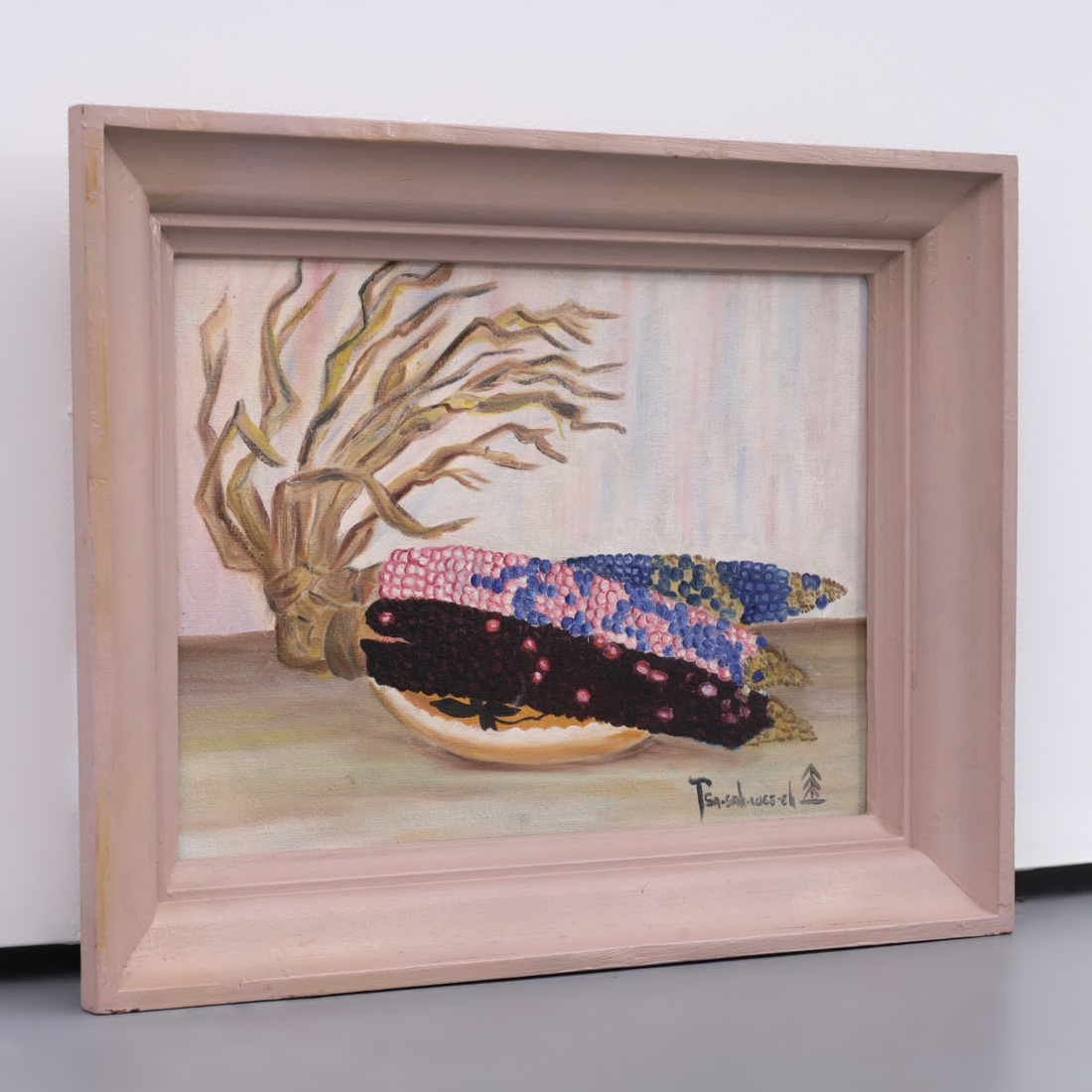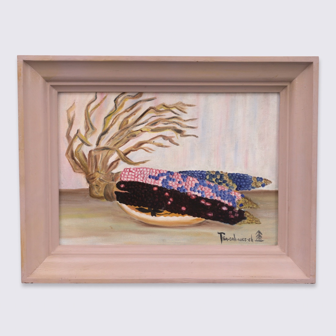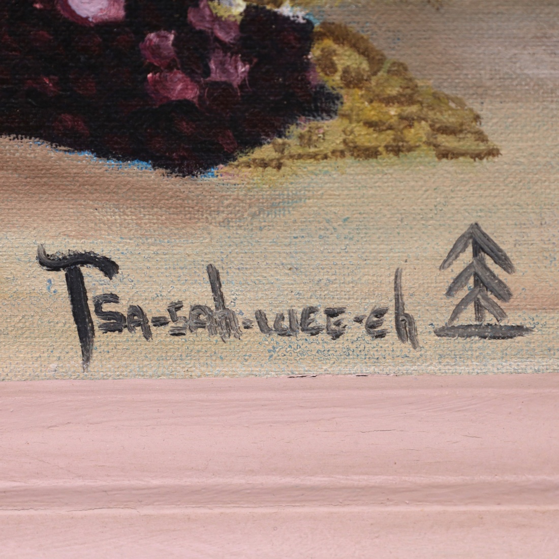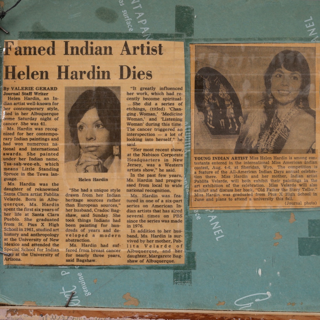 | Additional Information | Provenance: Collection of Frank Bergan Thompson, Rio Rancho, New Mexico. According to the consignor, her father, Frank Bergen Thompson, operator of the Tse’ Bonito trading post and son of Louis S. Thompson, owner of a large chain of Native American reservation trading posts, knew Helen Hardin from childhood and acquired this painting when she was approximately twelve years old. He purchased the work as an early expression of confidence in her developing artistic voice. Lot is accompanied by a copy of a photograph depicting the provenance holder, Frank Bergan Thompson, in his Tse' Bonita, New Mexico trading post, from the family archive. The painting is signed using Helen Hardin’s Tsa-Sah-Wee-Eh cipher, derived from her name, Little Standing Spruce. |