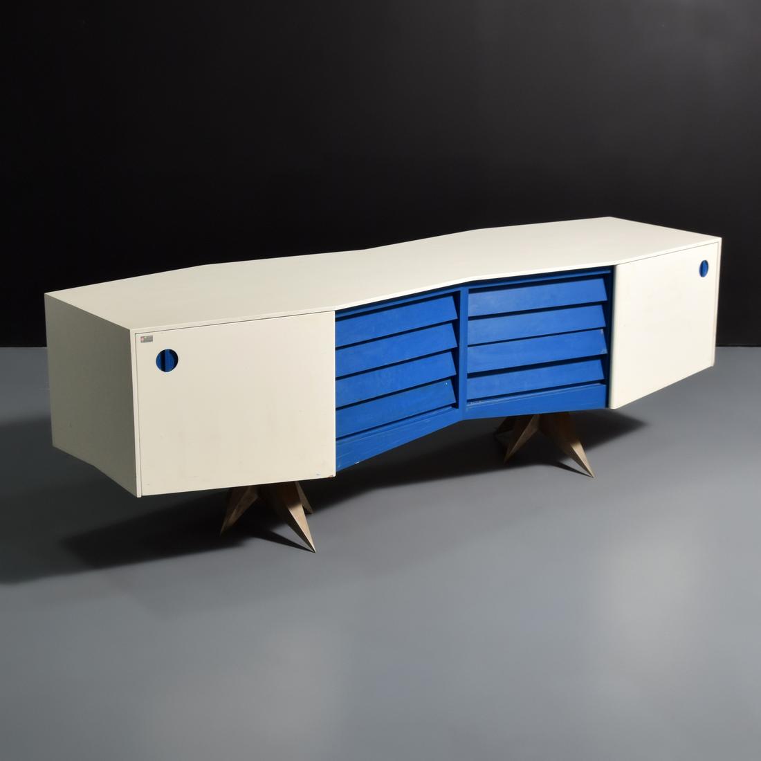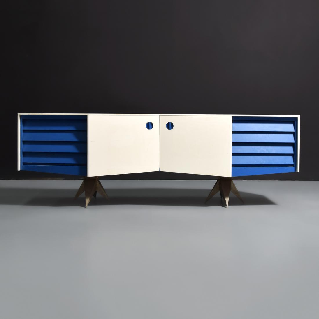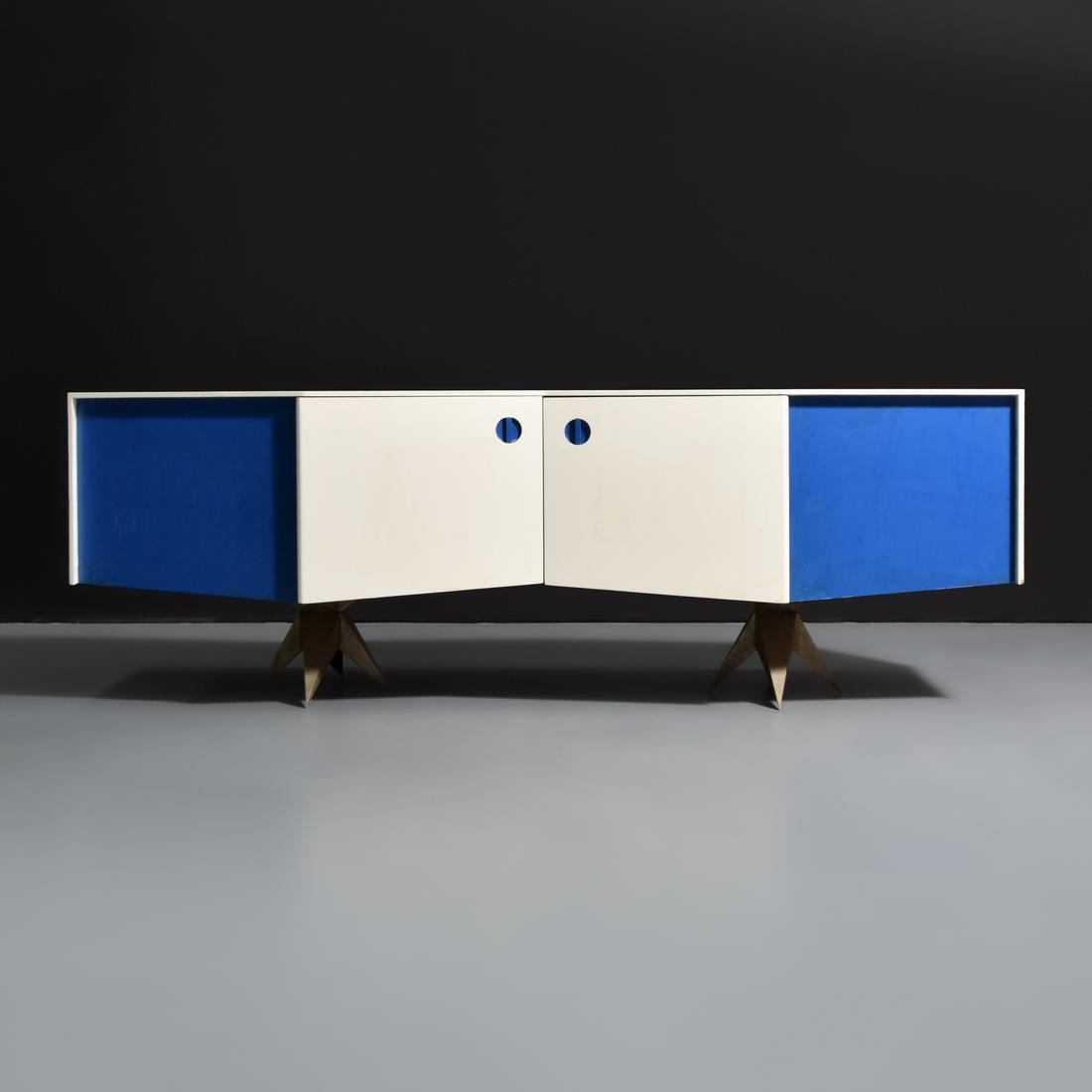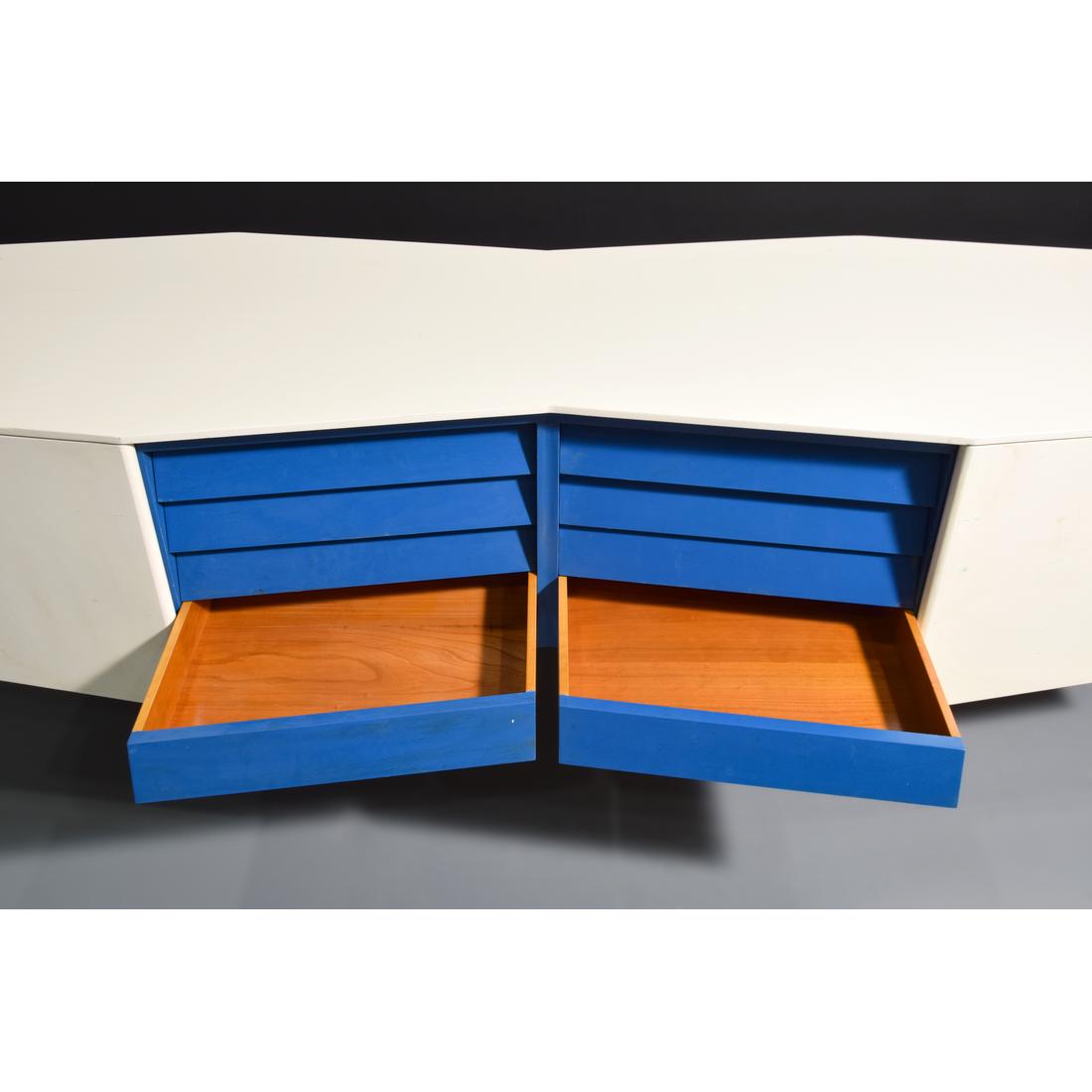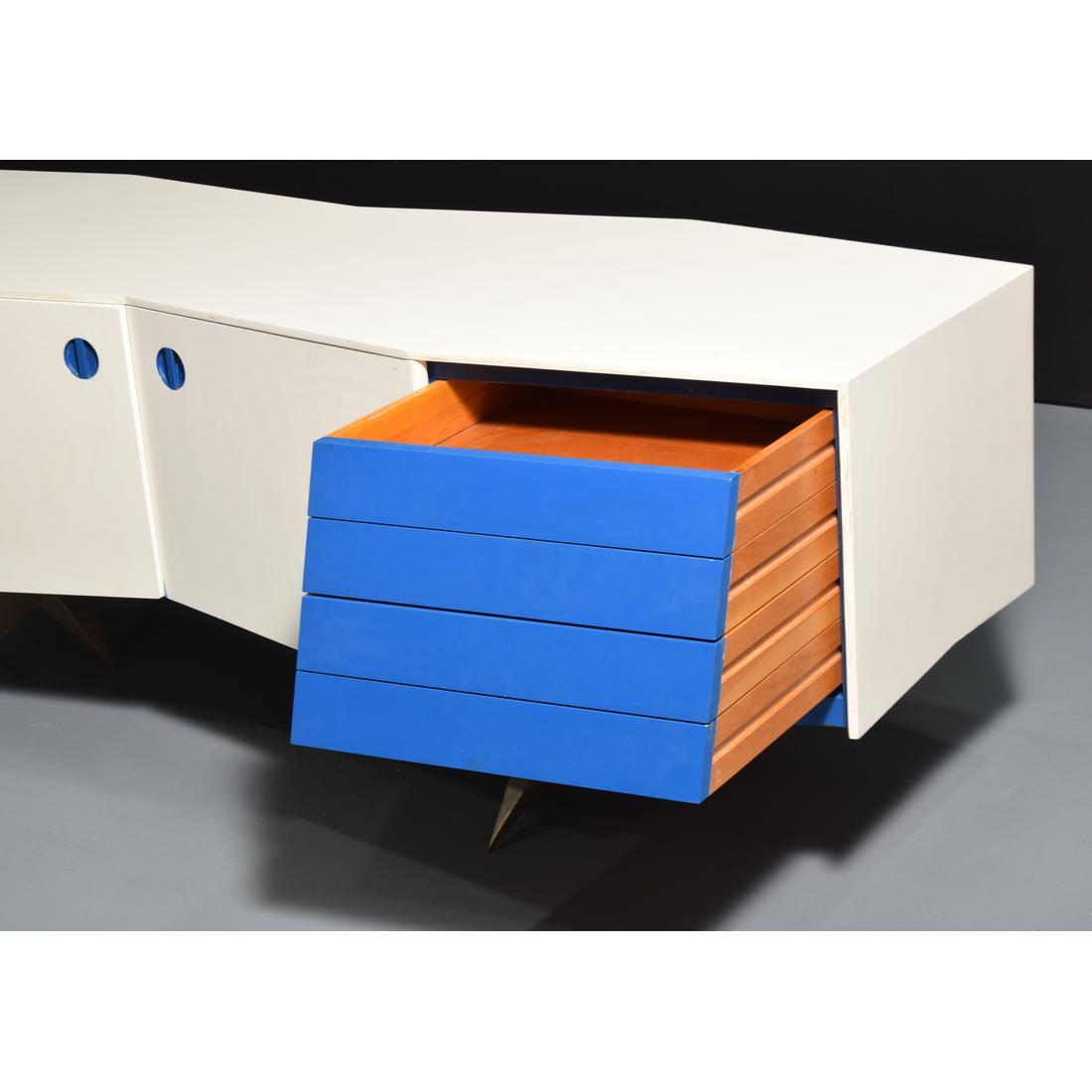 | Additional Information | Geometric cabinet/credenza rests on two star-shaped feet. It is finished on both sides, with doors hinged to allow configurations revealing or concealing the drawers. One side has a door on each end revealing four shelves each and the other has two doors revealing eight drawers. According to Tehran Projects, Villa Namazee was designed in 1957-1964 by Gio Ponti in collaboration with Fausto Melotti and Paolo De Poli. Photos of the villa include an interior reception room and balcony echoing the geometric lines, convertible design and two-tone finish of the cabinet. Provenance: Villa Namazee (Shafi and Vida Namazee), Tehran, Iran | Private Collection, New York, New York. Item is accompanied by the original certificate issued by Matteo Licitra, Independent Gio Ponti Archives, dated 11.29.2019, placing the cabinet on the first floor interior balcony room. Reference with additional photos and architectural plans: tehranprojects.com/villa-namazee-tehran. Gio Ponti's nephew Matteo Licitra is an architect and designer as well as an artist and musician. He has produced numerous writings, lectures, seminars studying and promoting his uncle's work worldwide, including publishing the Chinese language edition of the catalogue raisonne - Gio Ponti: The Complete Work, 1923-1978. Matteo Licitra worked closely with his mother and curator of the Ponti archives, Lisa Licitra Ponti, until her death in 2019. He then established the Independent Gio Ponti Archives with its own protocol for authentication. |