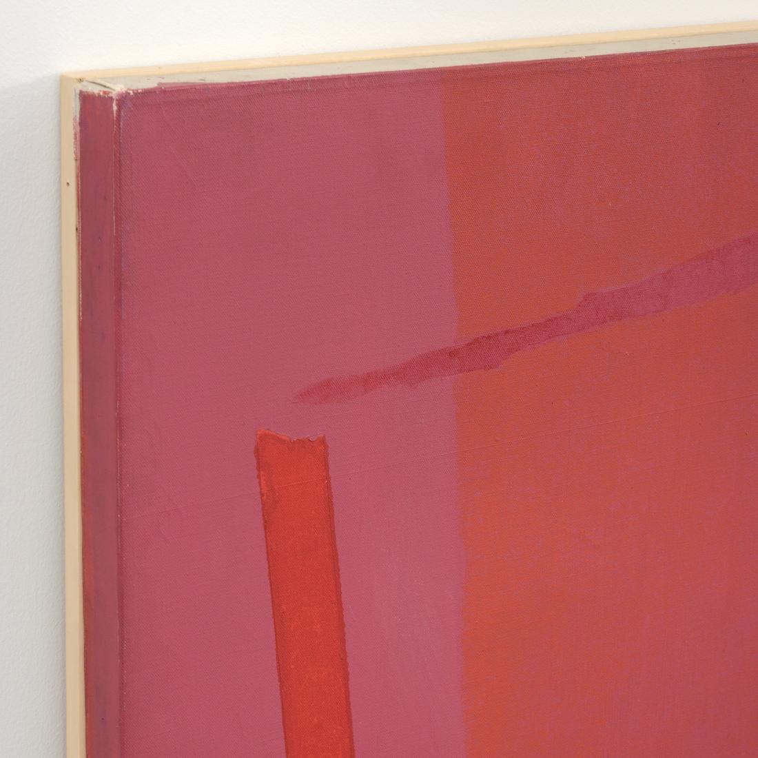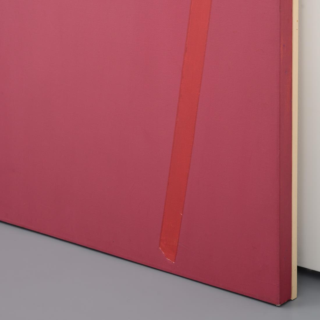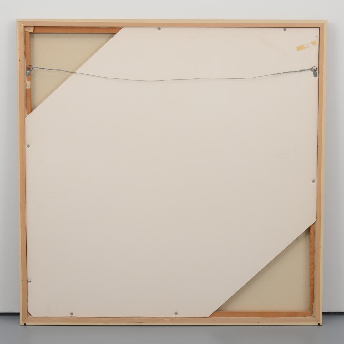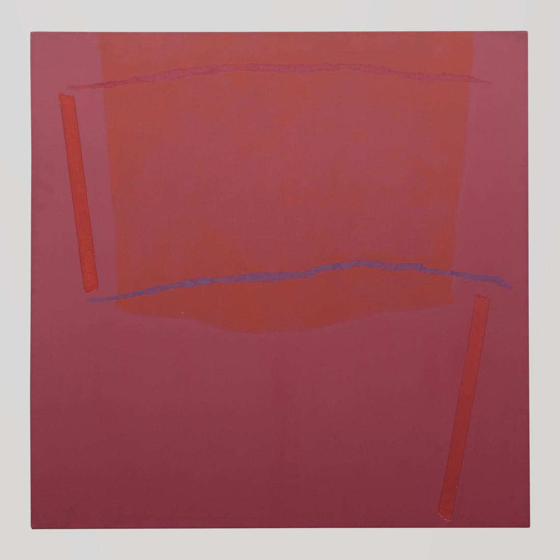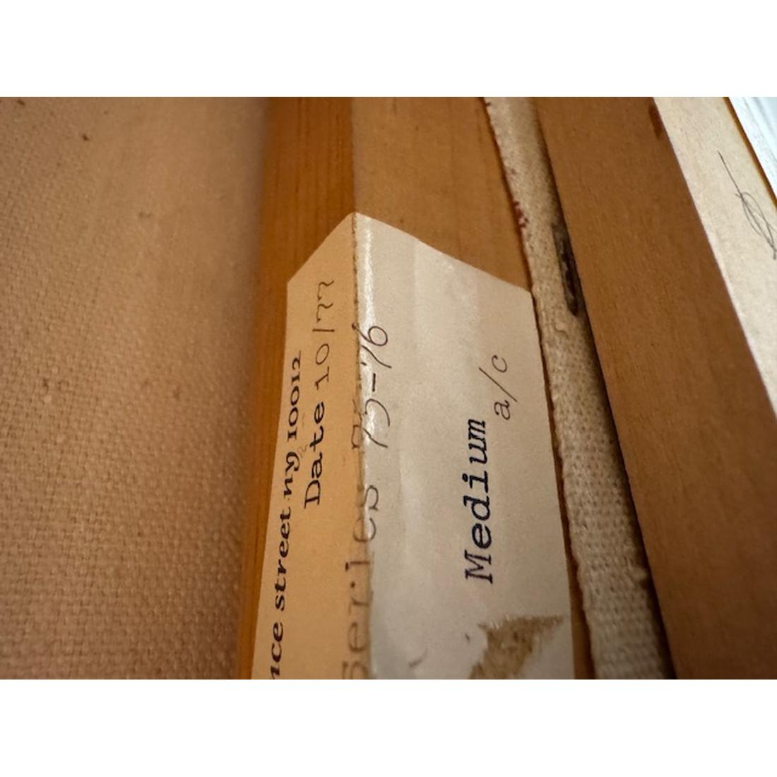 The work is titled “Infinity Field (Lefkada Series).” Gallery label to reverse: Louis K. Meisel Gallery, New York, New York. Painted circa 1975, this 54 inch square canvas typifies Stamos’s Lefkada period, pairing sun-bleached off-white grounds with sienna, deep red, ochre, and lapis passages that echo the Ionian landscape. Its meditative solemnity has been read as Stamos’s elegiac dialogue with his friend Mark Rothko, aligning the work with the broader Color Field abstraction of artists such as Helen Frankenthaler and Jules Olitski.