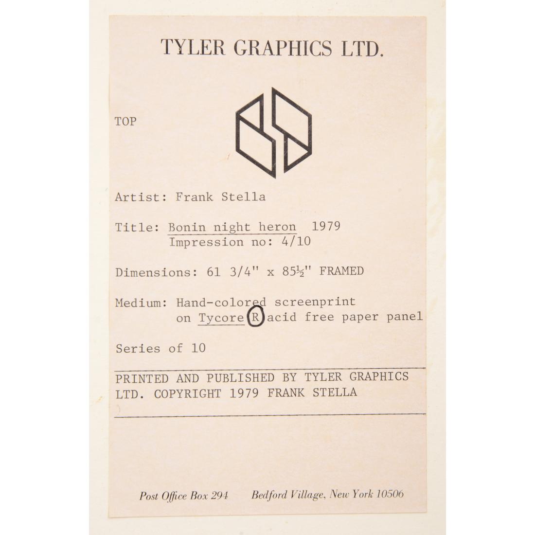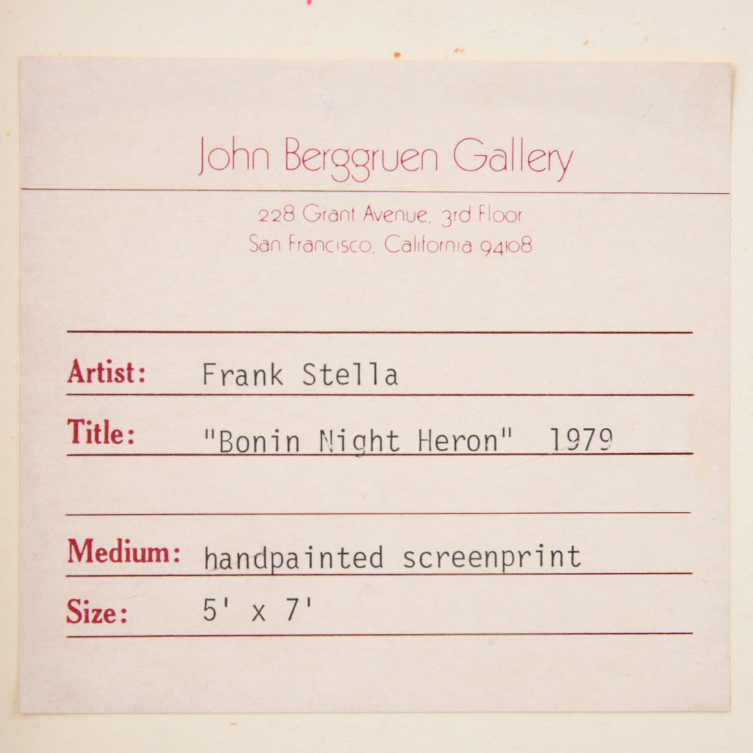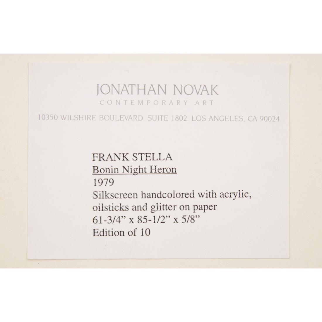 “Bonin Night Heron” was printed and published by Tyler Graphics, Ltd., Bedford, New York, with their label. Gallery labels to reverse: John Berggruen Gallery, San Francisco, California; Jonathan Novak Contemporary Art, Los Angeles, California. Each of the ten impressions in this exceptionally small edition was individually finished by Stella, making every example a unique stand-alone work akin to a painting.