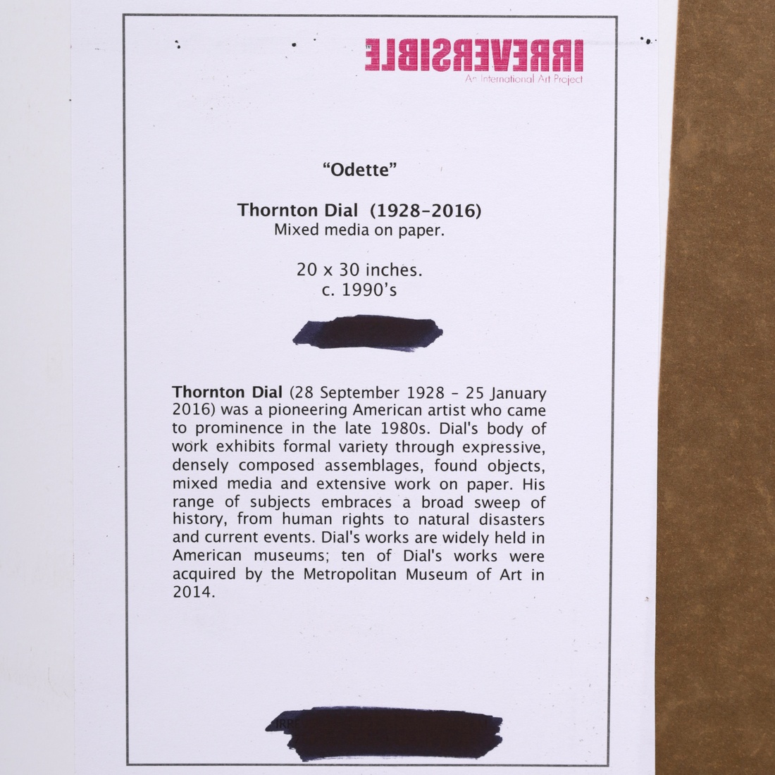 | Additional Information | Gallery label verso: Irreversible Projects, Miami, Florida |